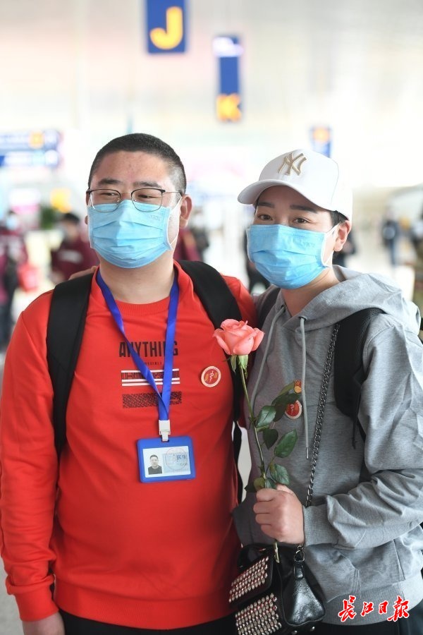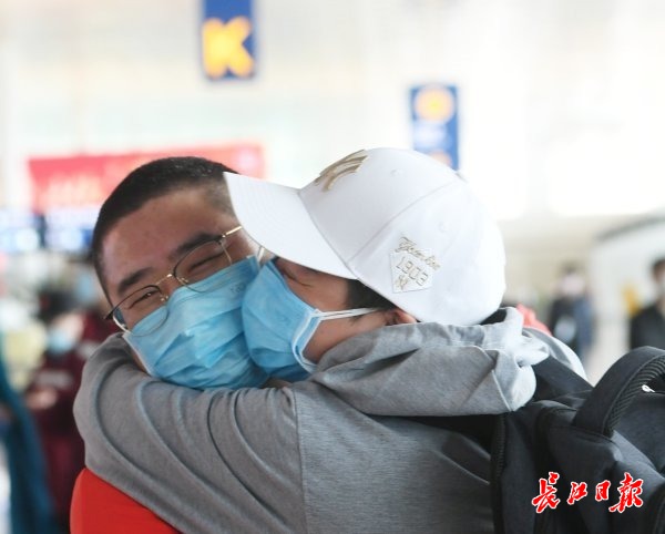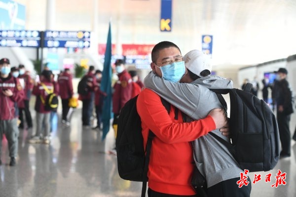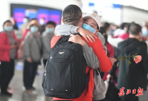 长江网3月20日讯 3月19日下午,武汉天河机场航站楼大厅内,河南援汉医疗队踏上返乡的行程。队员王国晓遇到40多天未见面的妻子郭燕芝,两人久久相拥,引来众多医疗队员的欢呼声与掌声。王国晓被安排在江汉方舱,郭燕芝则在青山方舱。夫妻俩同属河南省第五批援助队。(记者李子云 摄影报道)