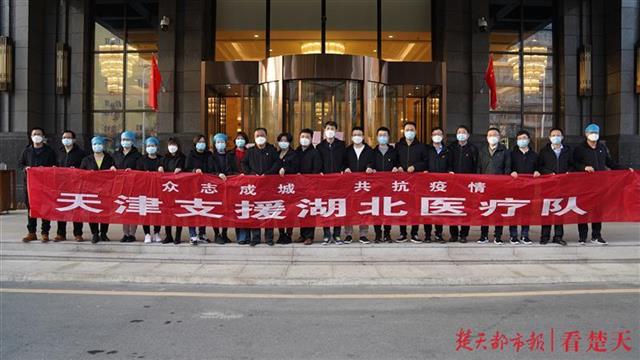 大堂外,医疗队员们整装待发,纷纷合影留念。大堂里,天津市蓟州区人民医院主管护师田兴原和队友们依依不舍地跟酒店服务员道别,大家面对面互相鞠了三个躬。在田兴原心中,酒店服务员的热情和周到,让她最为感触,“武汉在最困难的时候,拿出了最好的条件让我们来住,拿出了最好的饮食来给我们吃,我们就是发自内心的特别感激。”
