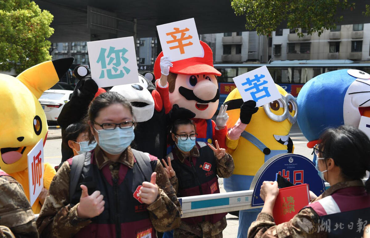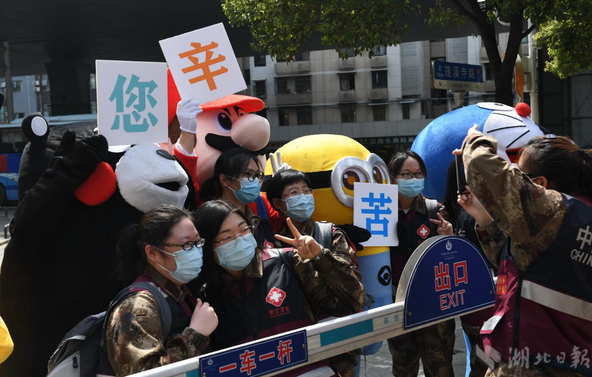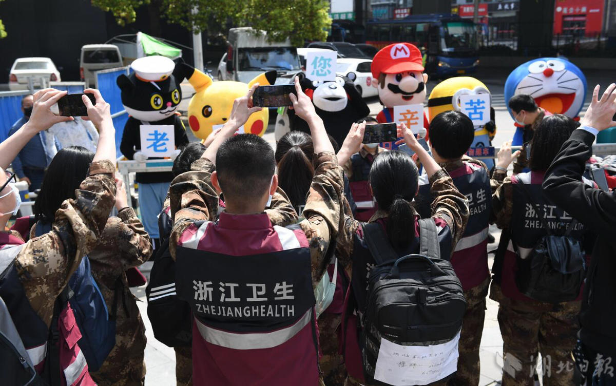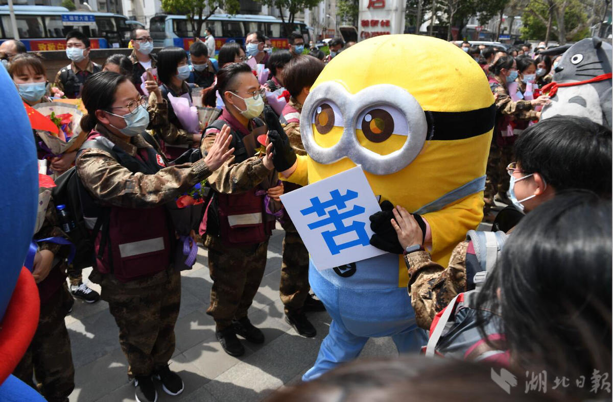3月19日,一群武汉90后志愿者得知援鄂浙江医疗队离开武汉返程,前往医疗队驻地,穿着玩偶给队员们送行,表达他们对医护人员的敬意。(湖北日报全媒记者 周立新 梅涛 摄)