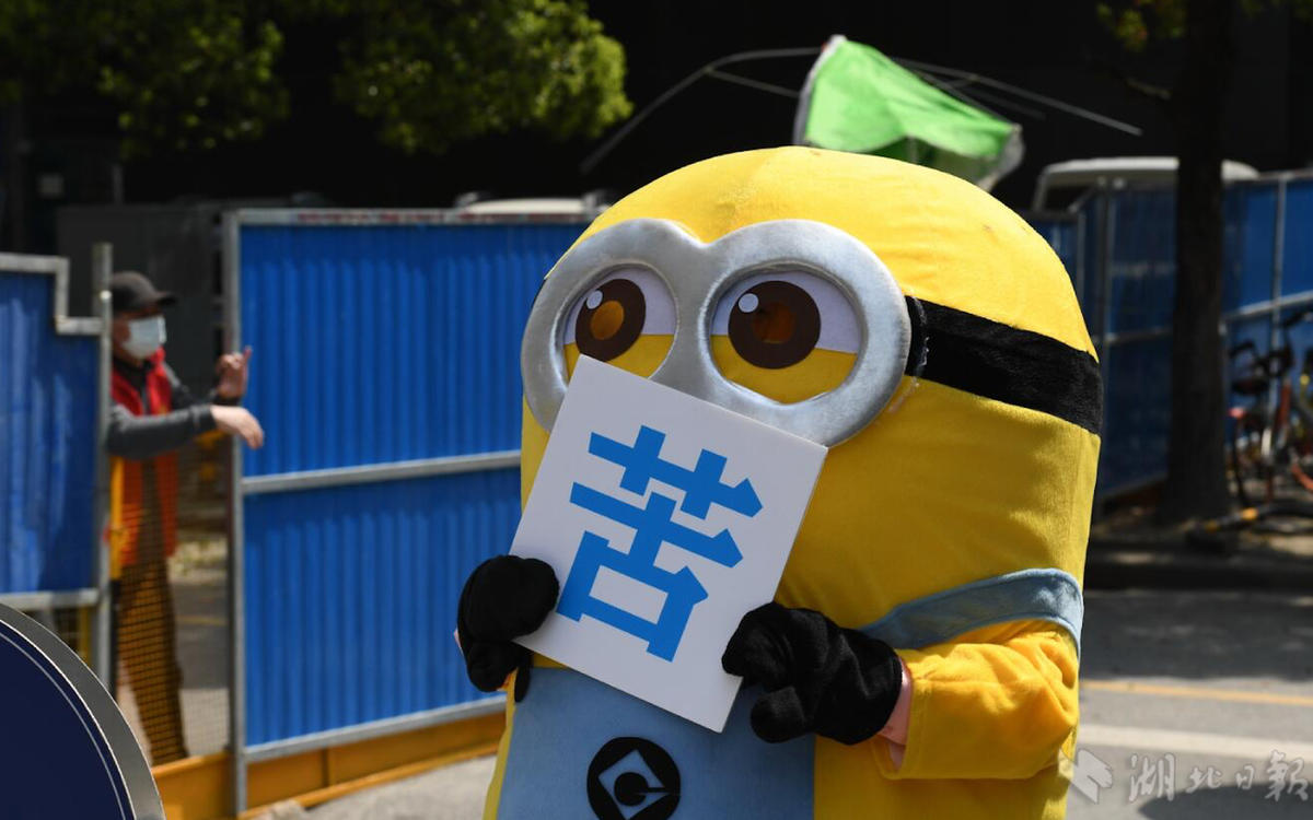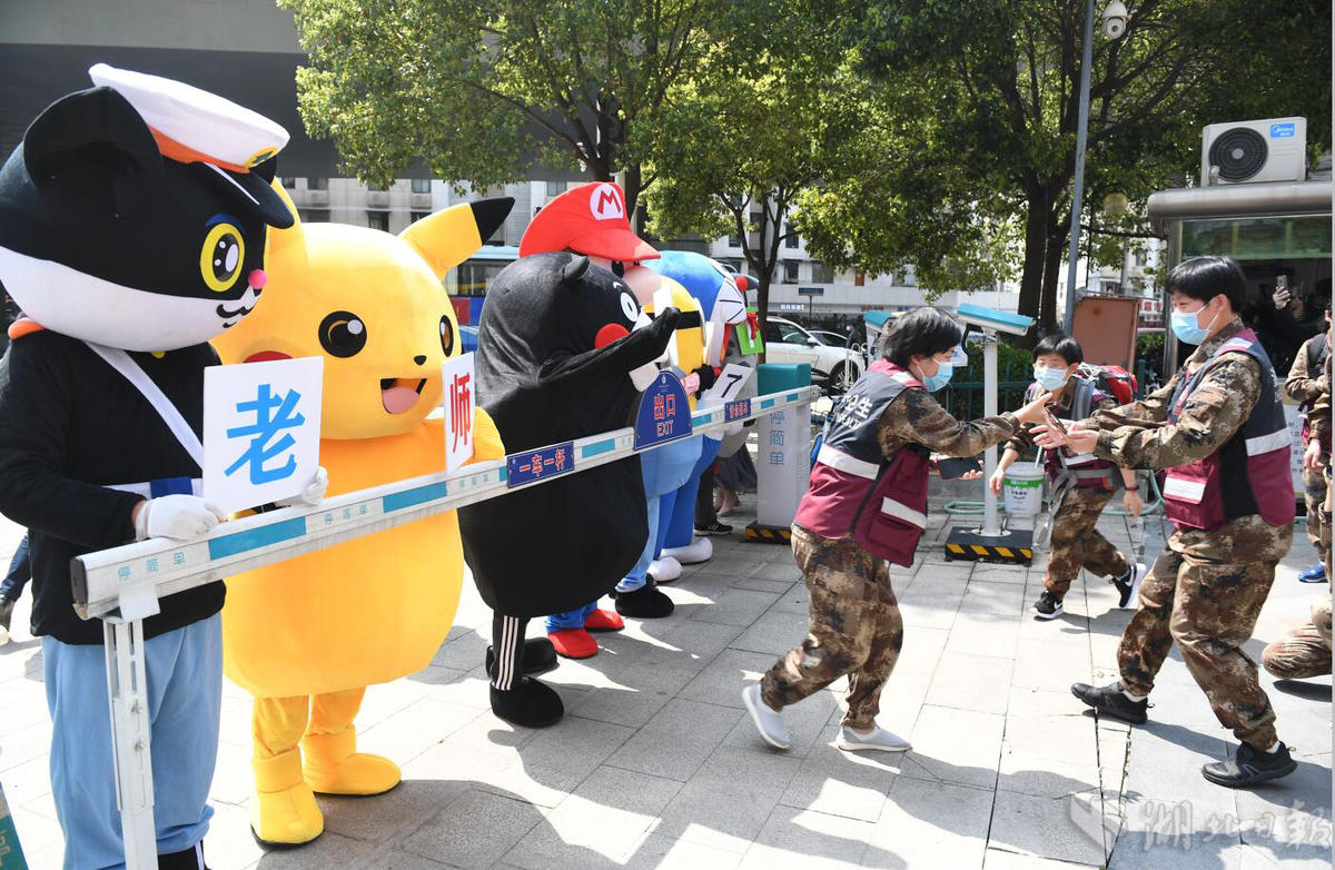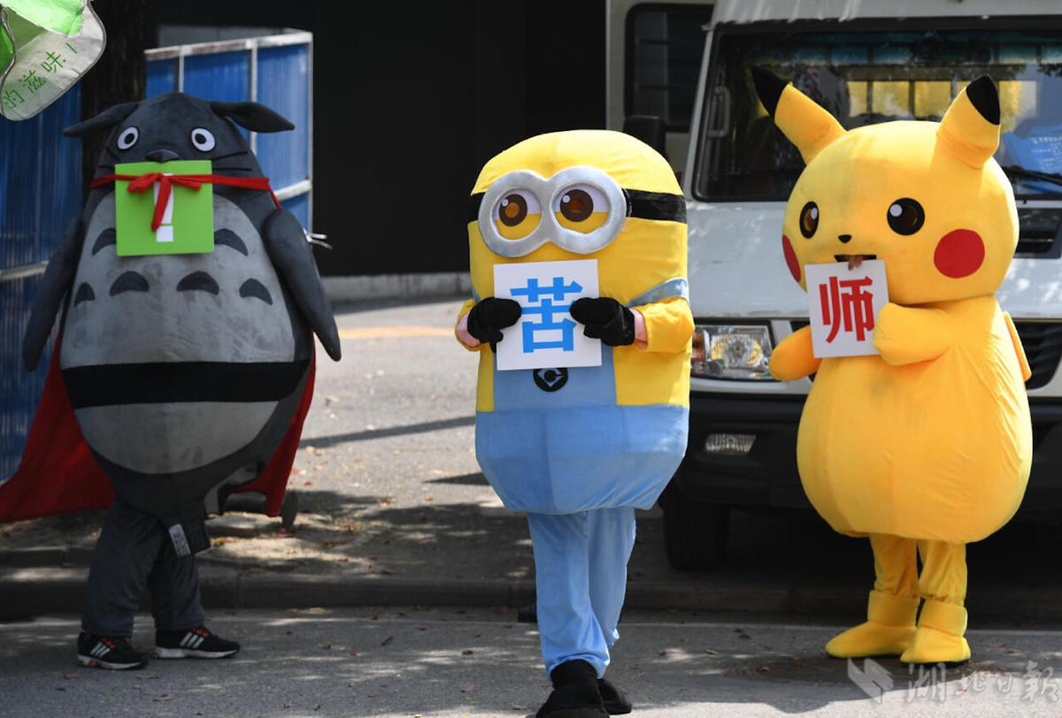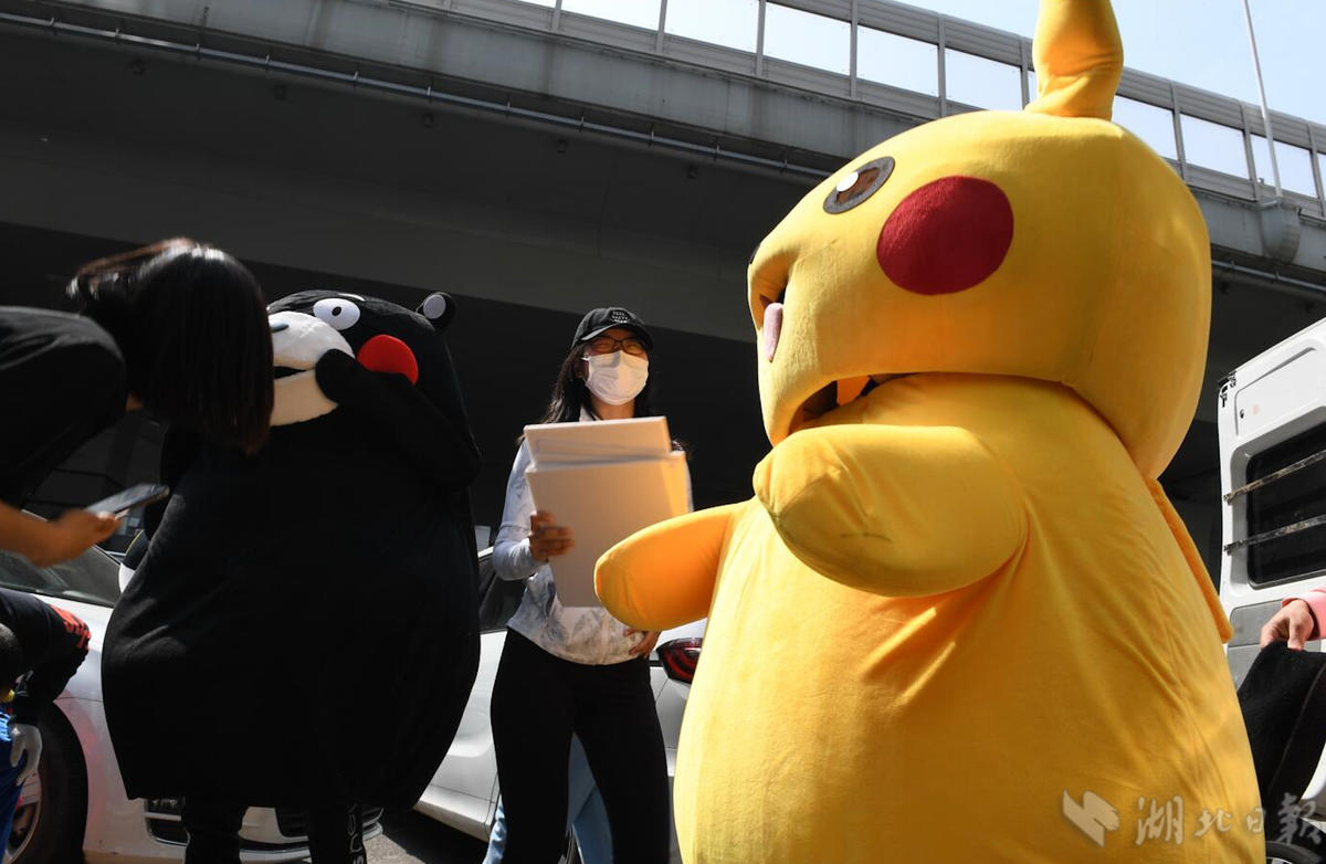 3月19日,一群武汉90后志愿者得知援鄂浙江医疗队离开武汉返程,前往医疗队驻地,穿着玩偶给队员们送行,表达他们对医护人员的敬意。(湖北日报全媒记者 周立新 梅涛 摄)