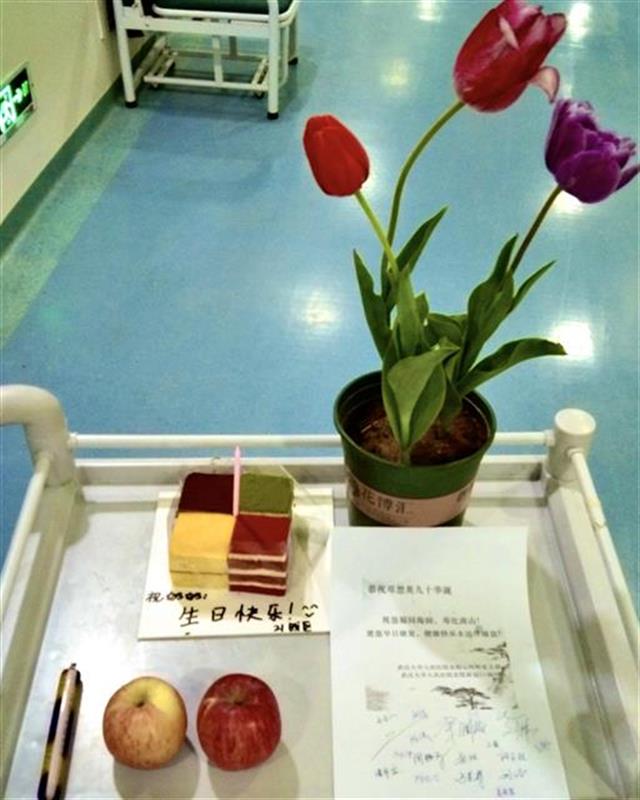 科室负责人余锂镭教授得知后,四处联系终于订到一个蛋糕,同时安排护士长刘炜准备了生日祝福语,嘱咐食堂专门定做了一份长寿面。当日晚餐时,余锂镭和刘炜带领值班医护人员一起为婆婆过了一个特殊的生日。一根火腿肠,两个苹果,寓意婆婆平平安安一起再过100岁生日。