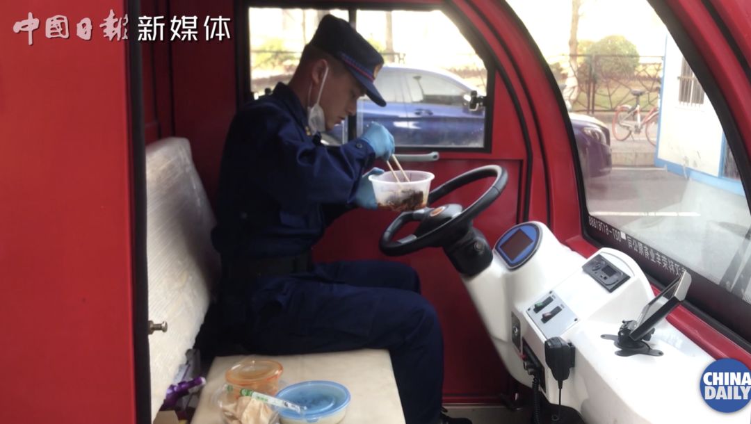 发完餐后,他便自己领一份到车上迅速吃完。