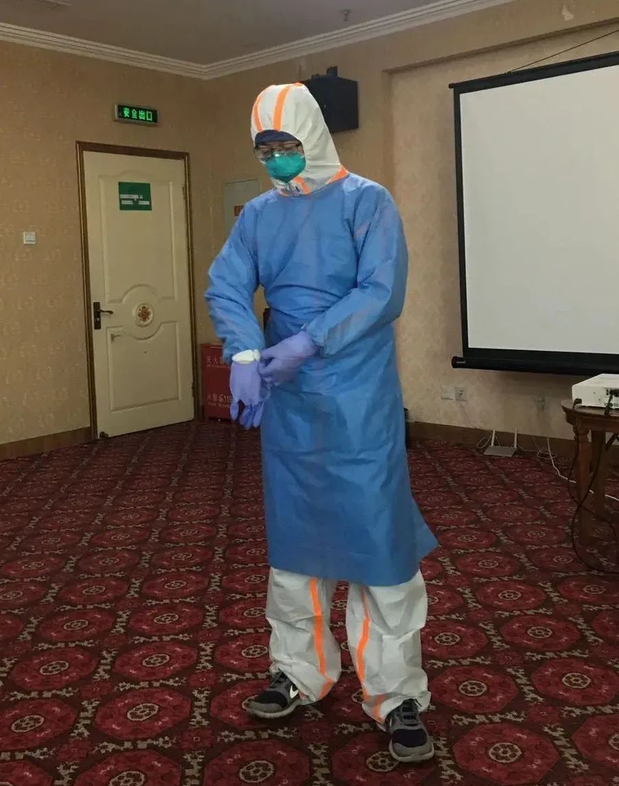 马艳辉在培训中进行穿脱防护服考核