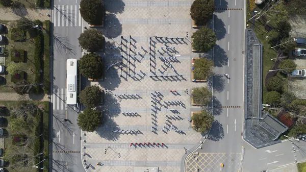到了同济医院中法新城院区的花园广场,队员们已经按昨天的规划,找到自己的位置,大家昂首伫立,用自己的身体在这片奋斗近两个月的土地上组成了“北医三院”四个大字,小庄昱擎着他那受伤的大拇指跑前跑后,声音已近嘶哑,无人机在头顶上飞来飞去,同济医院宣传中心的同志们协同媒体记者们齐心协力,为这个“北医三院”全力以赴。当乔杰院长带领队员们喊出“三院同济,同舟共济。春暖花开,胜利可期”时候,我的眼泪瞬间盈眶了,只能装做抬头看飞机,生生把眼泪逼回去。