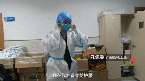 3月17日19时15分,在武汉市汉口医院二楼清洁区,广东省人民医院护士孔佩文和她的同事像往常一样穿戴好三级防护,准备进入广东医疗队接管的病区。