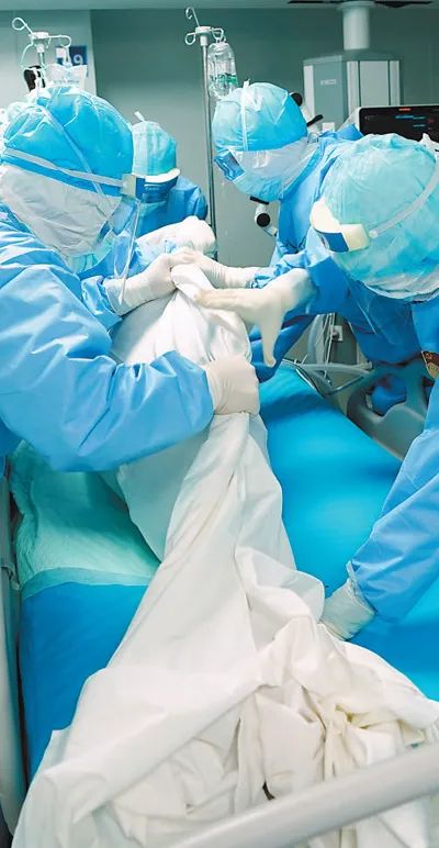 3月17日,在武汉火神山医院,医护团队在给重症患者实施俯卧位通气。新华社记者 王毓国摄