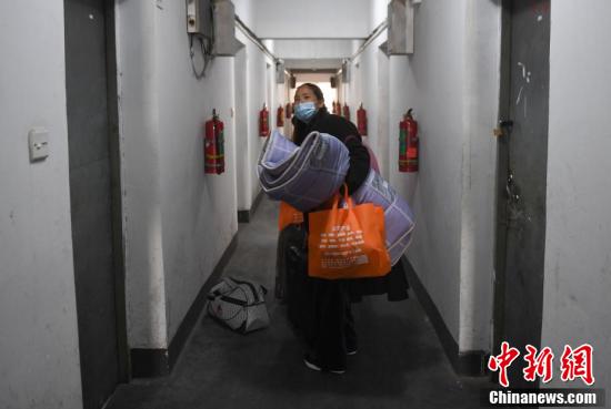 一位复工人员拿着行囊和生活物品进入宿舍。 中新社记者 王刚 摄
