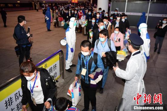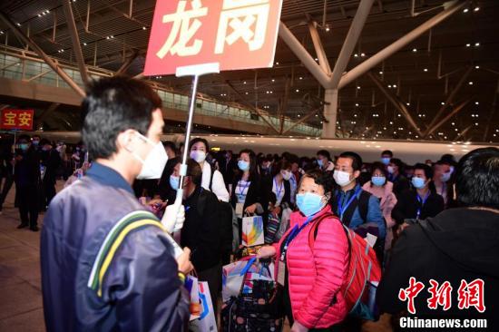 3月19日晚,首趟“点对点、一站式”集中精准输送湖北务工人员G4315次专列抵达深圳北站,该趟专列从荆州发车,共有169人。当晚,深圳市人力资源和社会保障局组织相关部门工作人员前来接站。截至3月18日,深圳市采用专车专列形式共接回员工16703人。中新社记者 陈文 摄