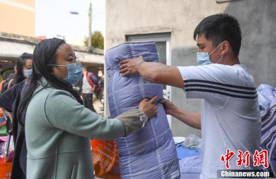 工作人员为复工人员分发床垫等生活物品。 中新社记者 王刚 摄