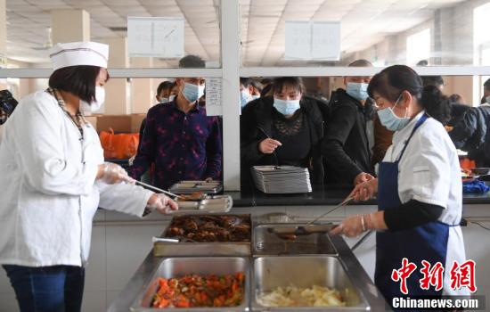 两名食堂工作人员给复工人员打餐。中新社记者 王刚 摄
