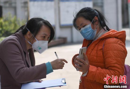 工作人员为务工人员做体温检测和扫码确认工作。中新社记者 姬东 摄