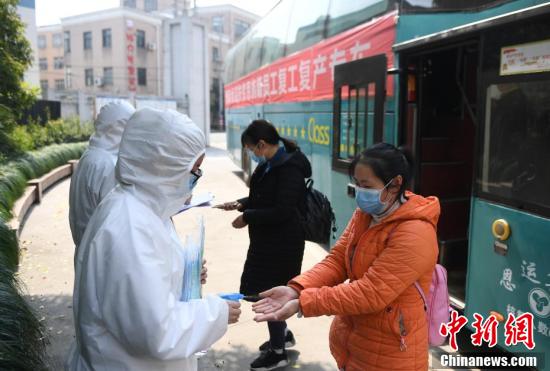 3月19日,湖北恩施复工人员到达杭州洲际食品有限公司后进行防疫消毒。当日,来自湖北省恩施州的首批146名赴杭州复工人员抵达浙江杭州。 中新社记者 王刚 摄