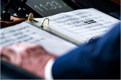 3月19日,记者拍到特朗普将讲稿中的“新冠病毒”划掉,手写改为“中国病毒”。(图片来源:《华盛顿邮报》)
