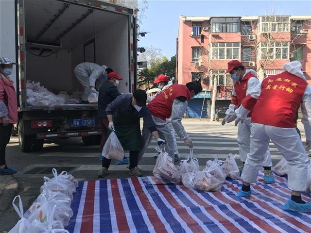 20分钟后,冷链车抵达下货点小东门社区怡博苑门口。车刚停稳,武昌区粮道街办事处公共管理办副主任余虹就招呼志愿者和社区下沉干部在地上铺好条纹布接货。然后,居民根据微信群叫号分批下楼领取。