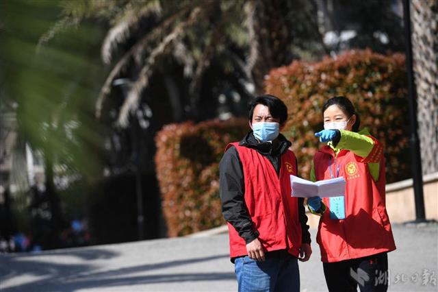 3月20日,武汉市梨园街东湖社区,省体育局游跳中心运动员、90后党员胡玥(右)与志愿者商讨楼栋垃圾筒设置和清运方案。疫情发生以来,主动担任楼栋网格员的胡玥和同伴坚守在社区一线,确保小区防控安全。(湖北日报全媒记者田悦 摄)