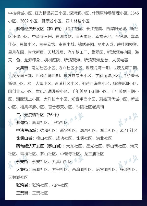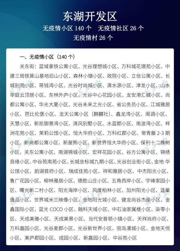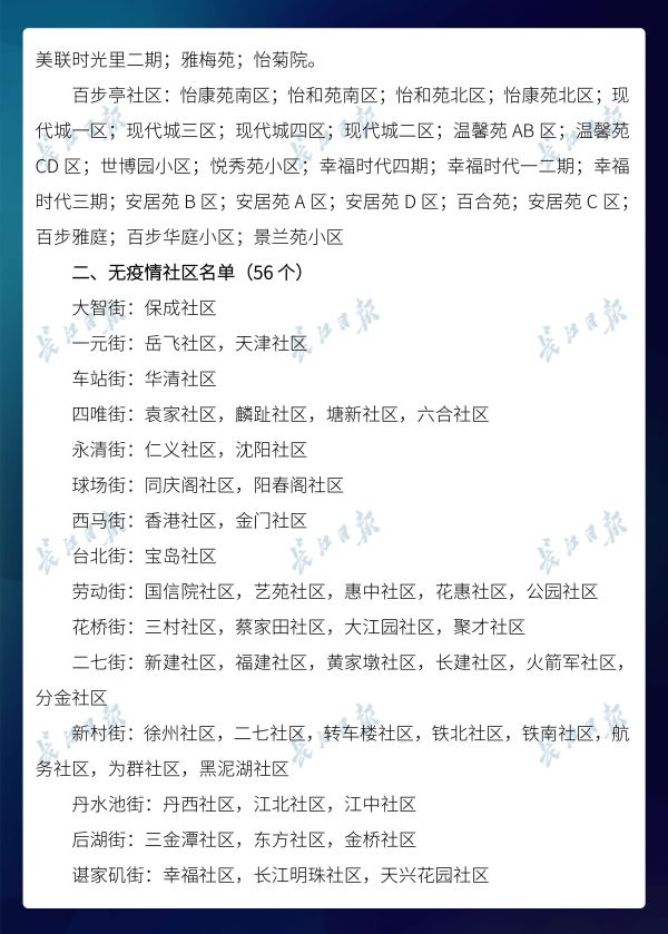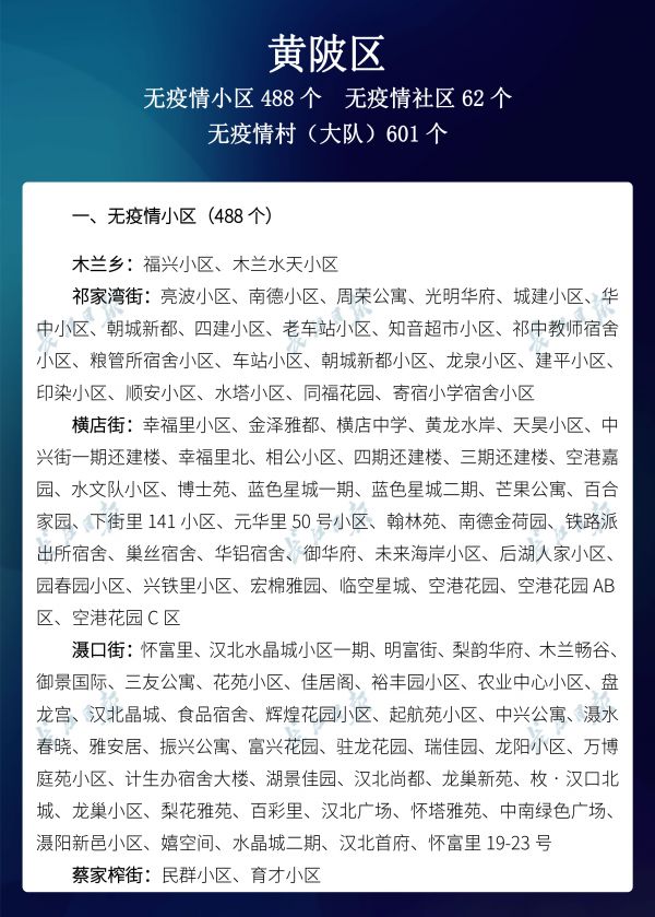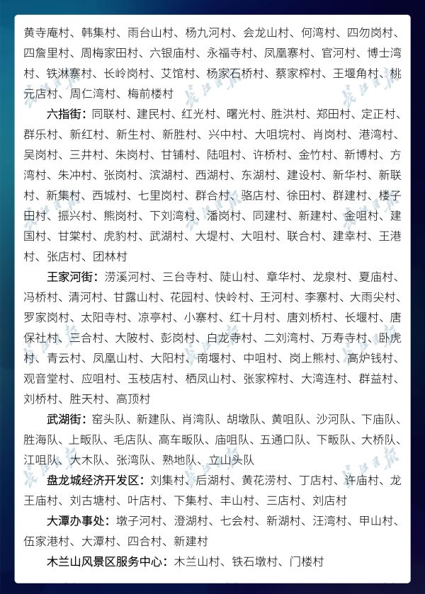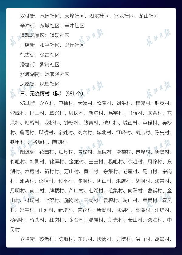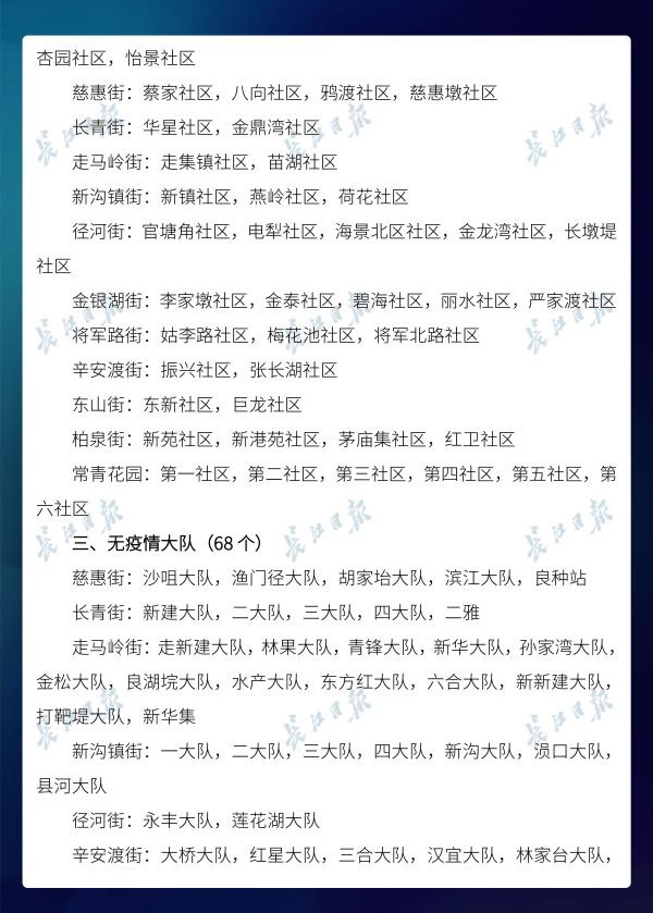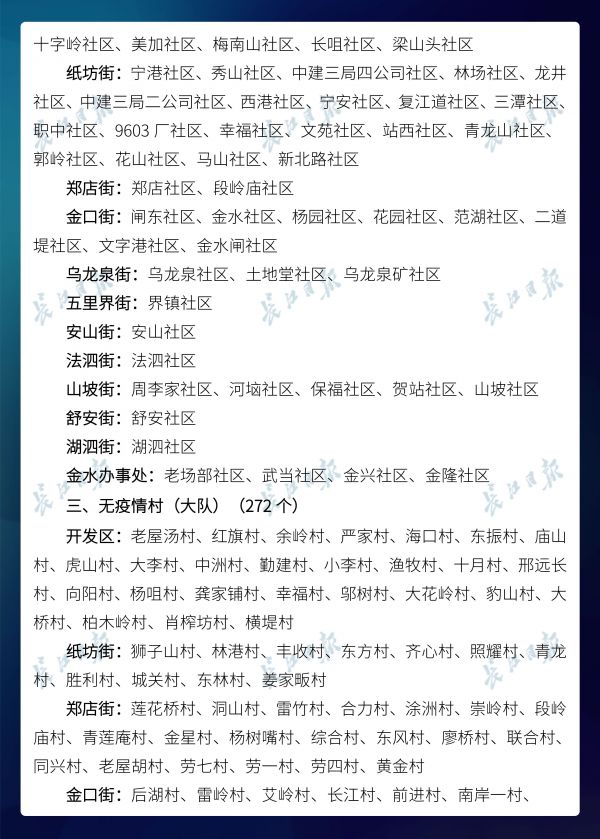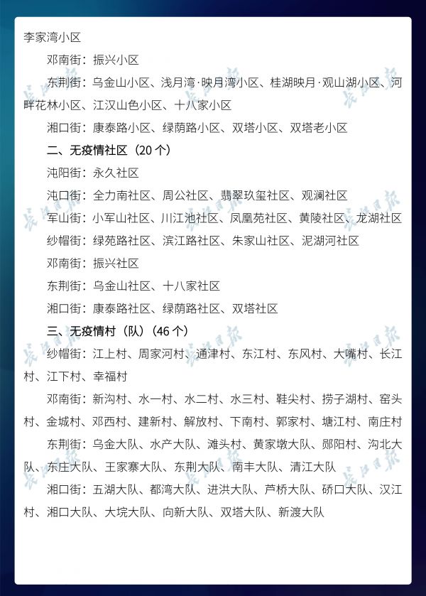 长江日报-长江网3月20日讯3月20日,武汉市新冠肺炎疫情防控指挥部社区疫情防控组公布全市第六次评定的无疫情小区、社区、村(大队)名单,命名第二批11个无疫情街道(乡镇)。截至3月20日16时,武汉已命名无疫情街道(乡镇)21个,洪山区天兴乡是中心城区首个无疫情街道(乡镇)。