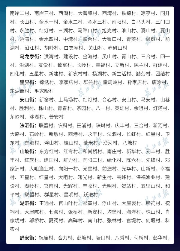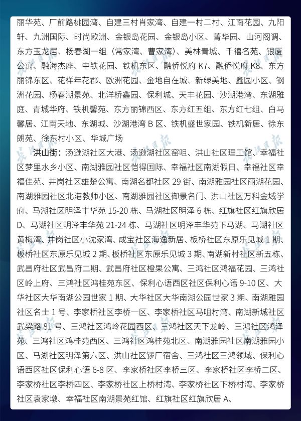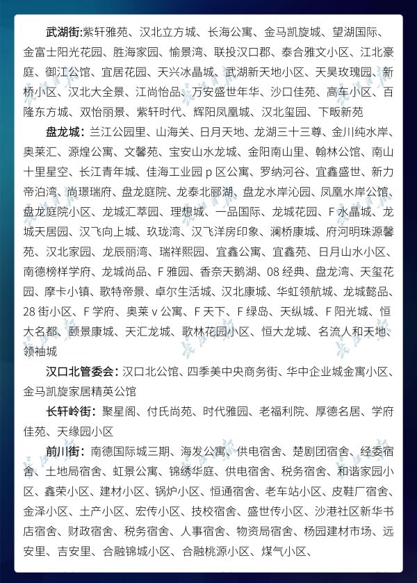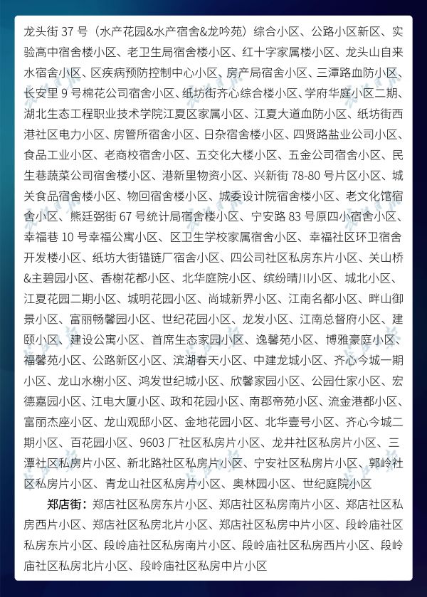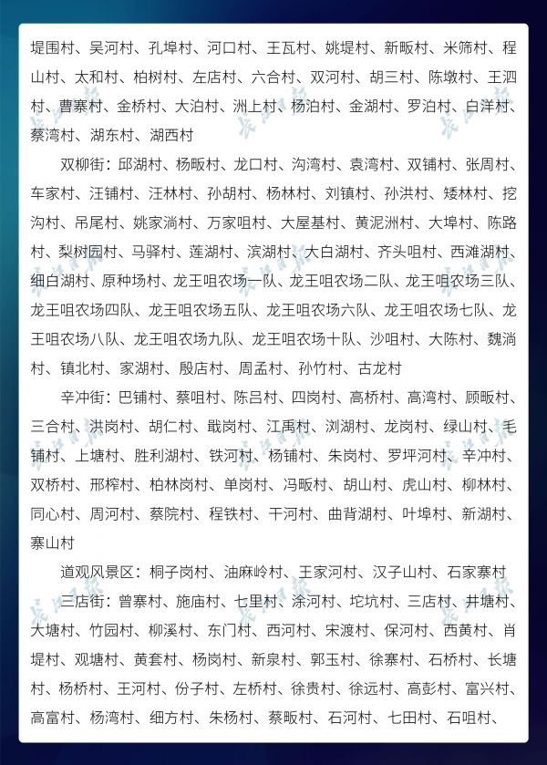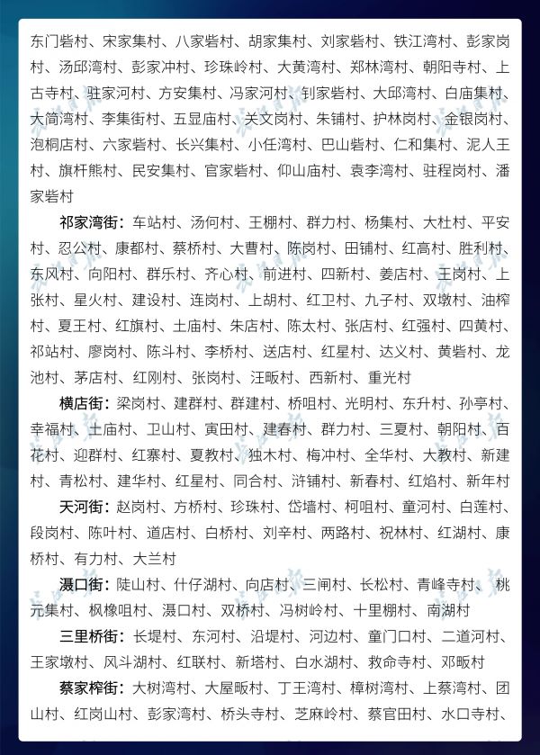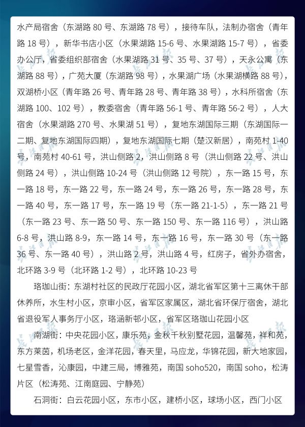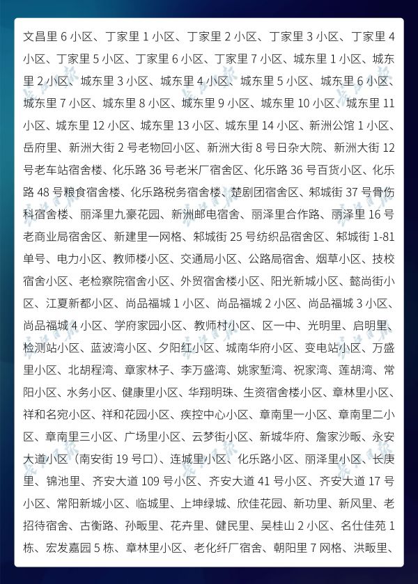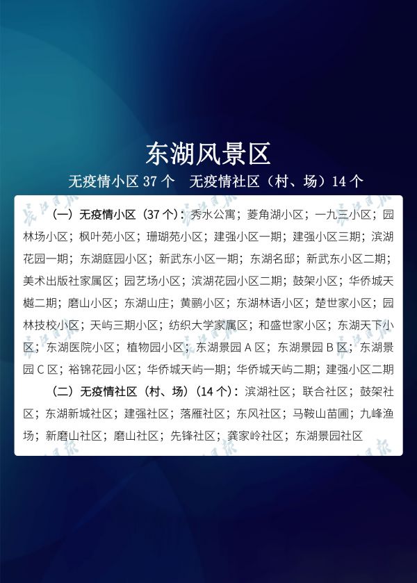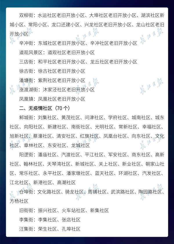 长江日报-长江网3月20日讯3月20日,武汉市新冠肺炎疫情防控指挥部社区疫情防控组公布全市第六次评定的无疫情小区、社区、村(大队)名单,命名第二批11个无疫情街道(乡镇)。截至3月20日16时,武汉已命名无疫情街道(乡镇)21个,洪山区天兴乡是中心城区首个无疫情街道(乡镇)。