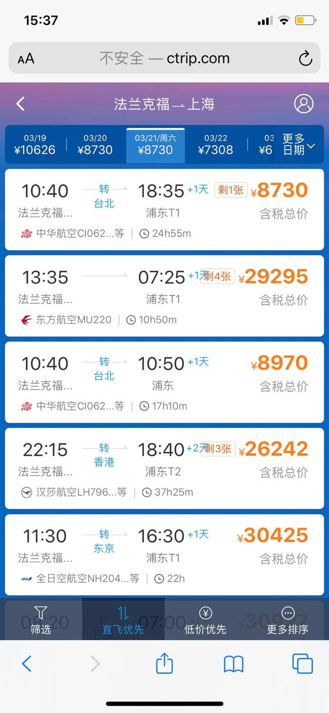 胡雨濛向记者展示了订票页面,从法兰克福机场出发直飞浦东的机票已经接近3万元人民币,“以往这个季节直飞往返最低才四千多。”因为疫情导致考试和开学延期,上周胡雨濛认识的几个学生临时回国了,但她表示,随着疫情严重起来,最近回国的同学并不多。