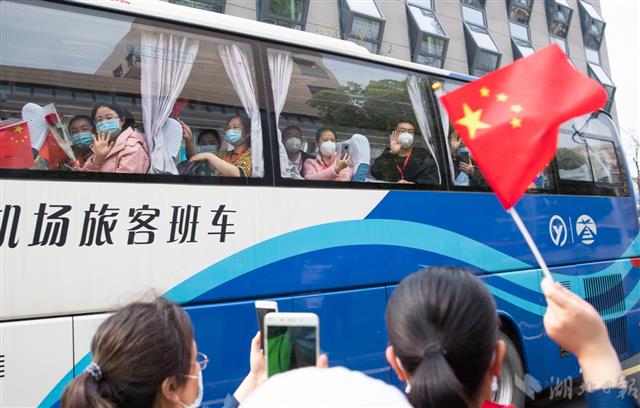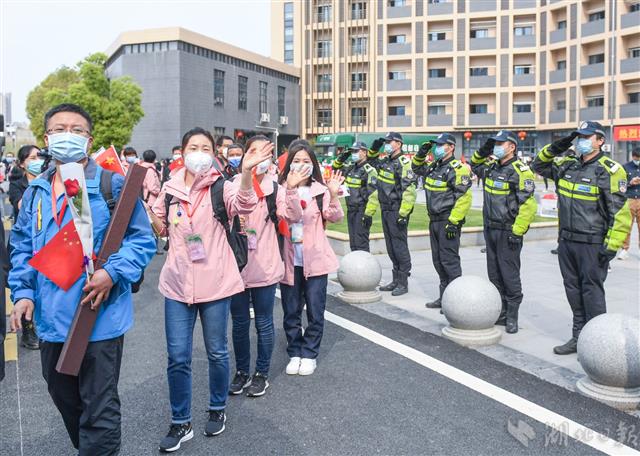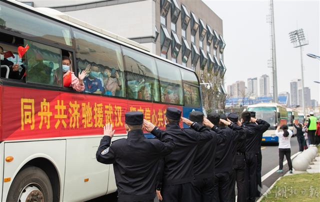 3月21日,武汉市足协球员公寓,交警敬礼欢送甘肃医疗队。当天,在武汉抗疫一线坚守了45天的甘肃首批支援湖北医疗队返程。(湖北日报全媒记者 柯皓 摄)