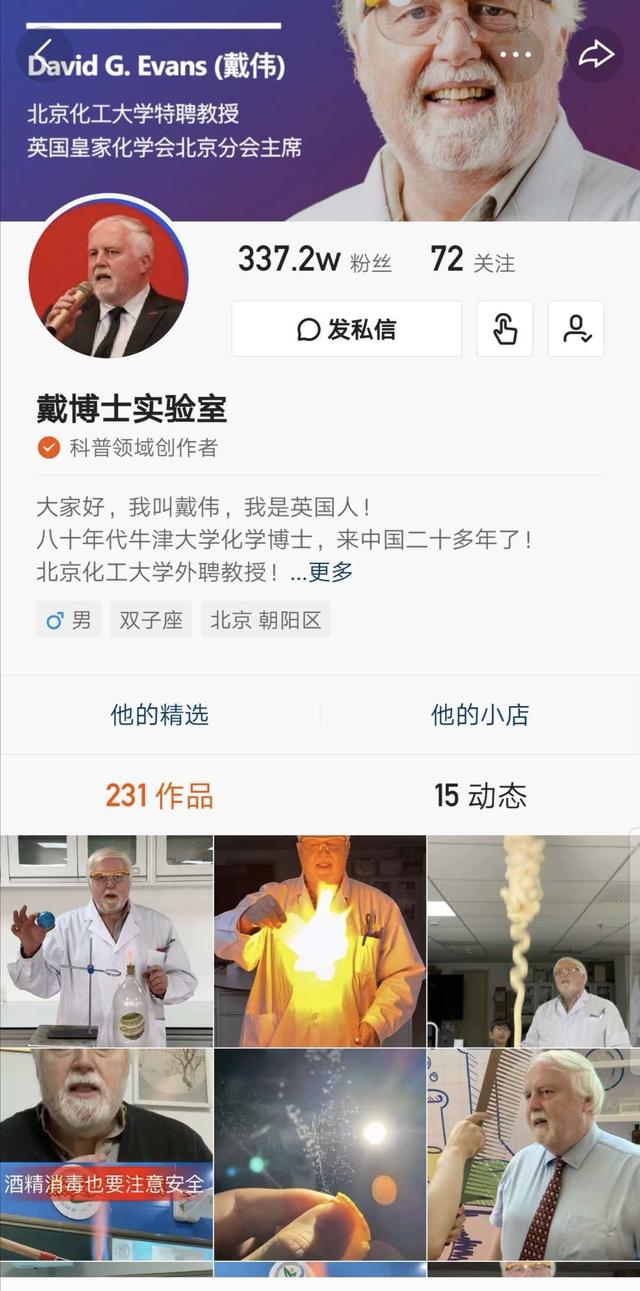 戴伟(David G. Evans)有很多头衔,他是牛津大学毕业的化学博士、英国皇家化学学会北京分会主席、北京化工大学特聘外籍教授、英国官佐勋章获得者。现在,他又多了一个头衔,那就是在网上拥有300多万粉丝的“科普大V”。