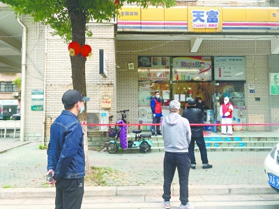 华锦社区居民在便利超市外排队等候进店选购。长江日报记者汪峥 摄