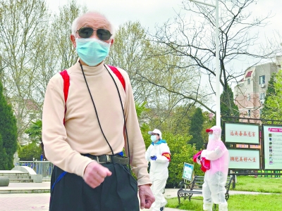 居民乔玉珍正在小区内散步,她说19日晚上,社区通过门栋组长告诉了大家可以有序下楼、在小区内活动的好消息。“社区工作人员很辛苦,真的感谢他们!”