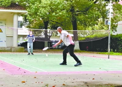 “有点生疏了,活动活动才行。”在小区乒乓球场,64岁的朱胜利和62岁的容加喜两位居民一起清理出一张球台,拉好球网打起了乒乓球。居民李仁春则在活动肩膀,他笑着说:“锻炼锻炼,免得肌肉萎缩了。”