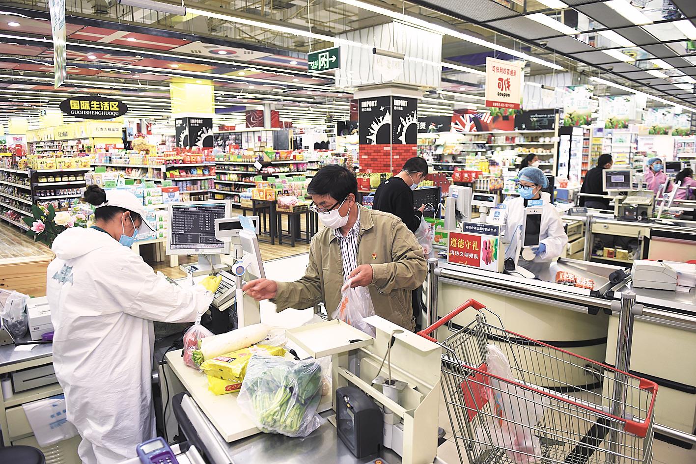 3月21日,武汉市江汉区武商量贩百圣店,市民在收银台前结账。日前,武汉市疫情防控指挥部决定,无疫情小区和社区将有限放行,商业设施和商业网点将逐步有序开放。 (湖北日报全媒记者 李溪 摄)