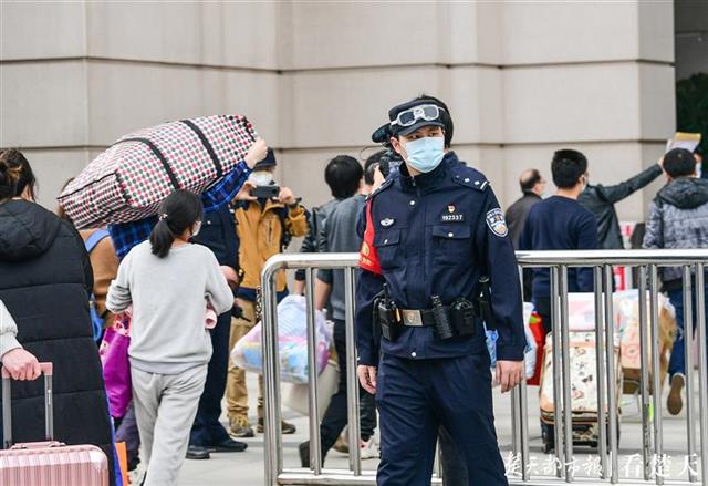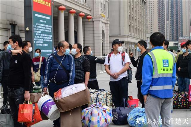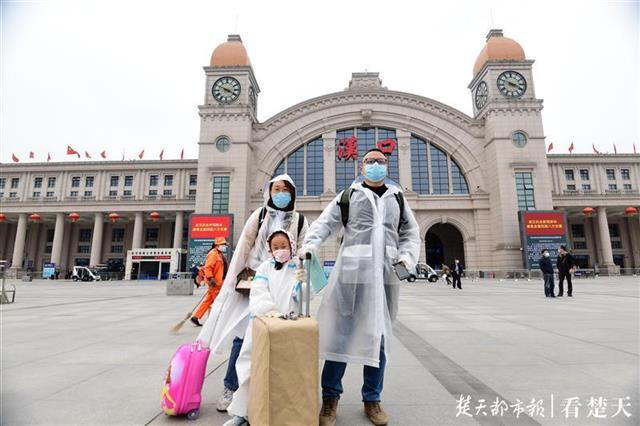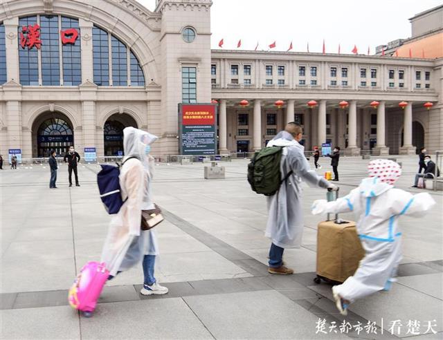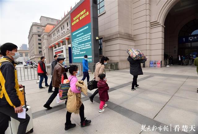 下午,一些人的脚步声打破了站前广场的宁静。他们多是年轻人,也有少许的儿童,携带着旅行箱或厚重的背包,有的还带着胶桶。据了解,他们是滞留在武汉的人,现在赶着回去上班。他们中的很多人,本来计划于1月23日从汉口站离开,但因疫情留在了武汉。近日,因复工需要,武汉打开部分人出城的通道,他们就是在这一政策下,通过审核、检查,在武汉各区防疫部门的组织下,有序出行。