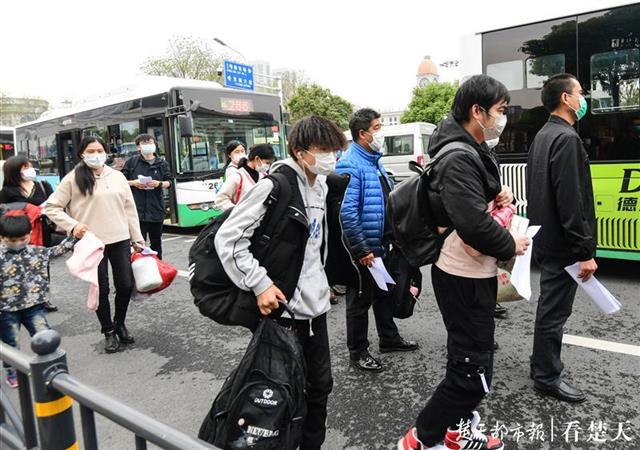 滞留人员在各区防疫人员的带领下,通过公交专车来到汉口火车站