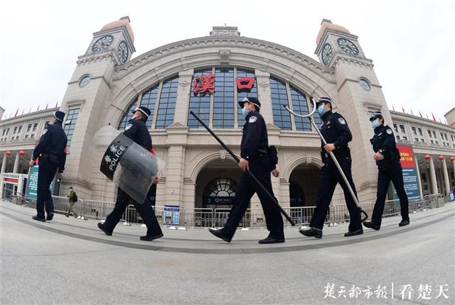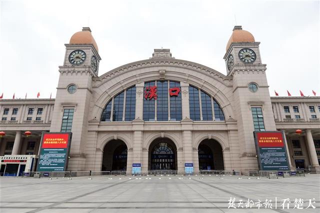 3月23日上午,温暖的阳光照在汉口火车站广场上。在武汉抗击新冠肺炎的战斗中,该站处于封停状态。