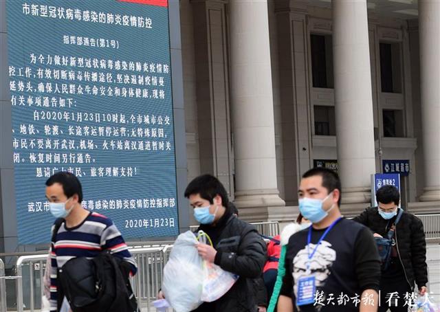 火车站大楼进站通道两边的巨型广告上,显示着“武汉抗击新冠肺炎 感谢全国四面八方支援”“市新型冠状病毒感染的肺炎疫情防控指挥部通告”,落款为“2020年1月23日”。从这一天起,武汉所有出城交通、市内公共交通停运,汉口站的时间似乎一直凝固在两个月前。