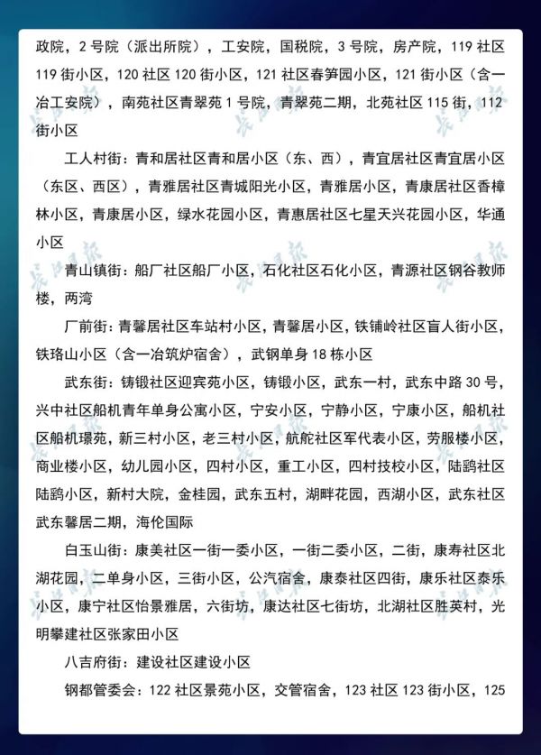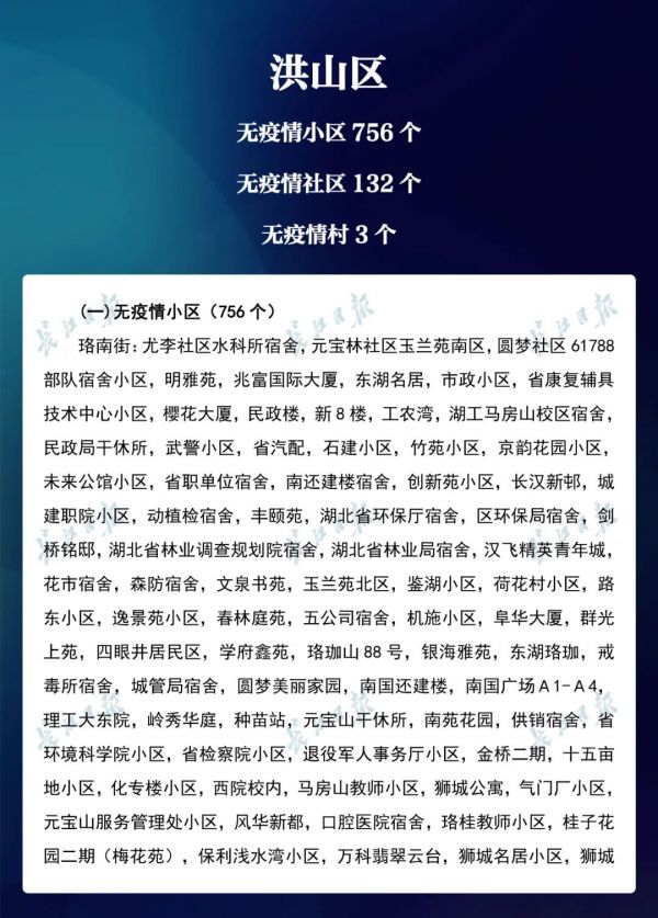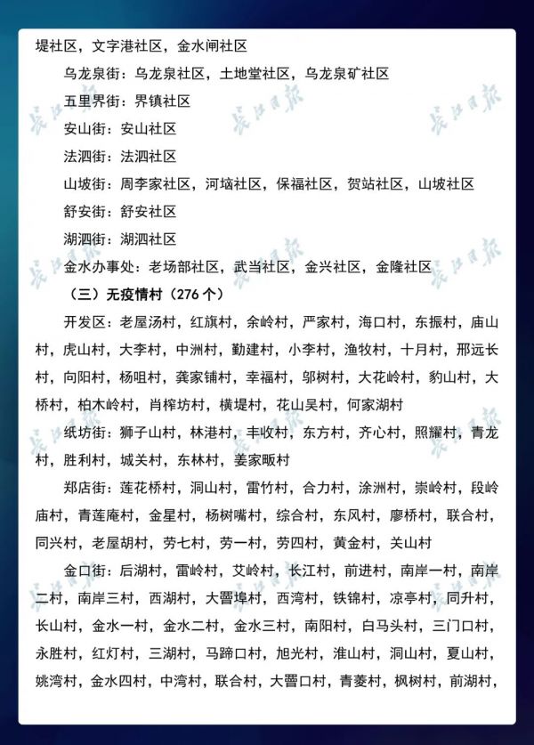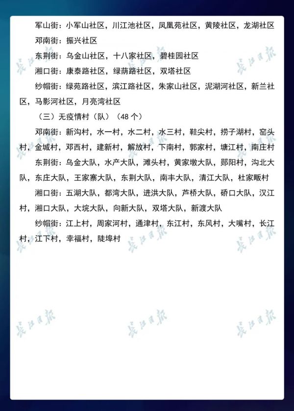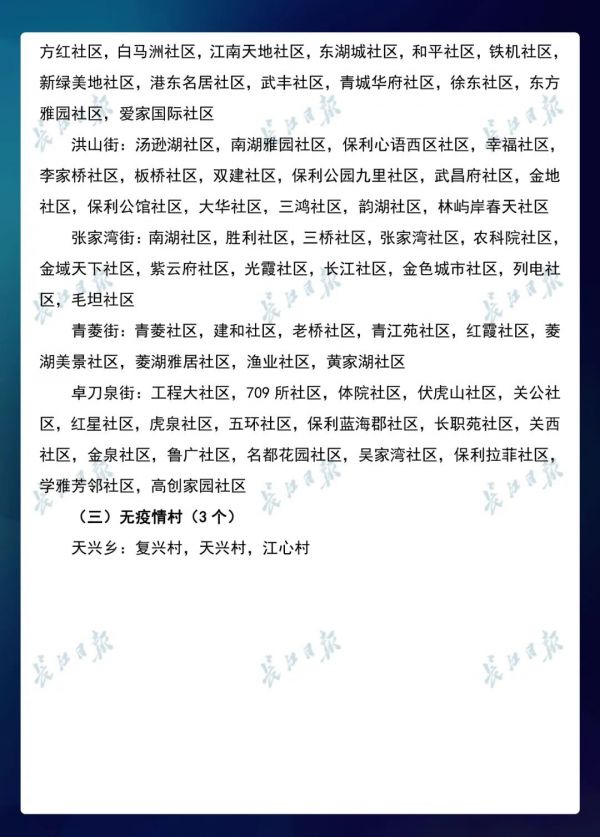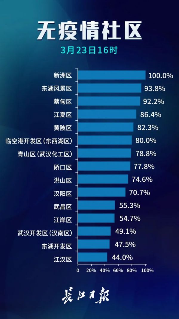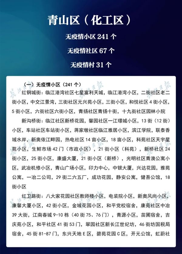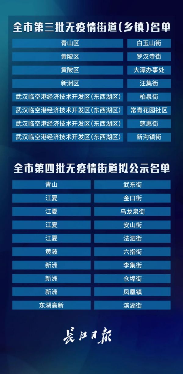 3月23日,武汉市新冠肺炎疫情防控指挥部社区疫情防控组公布全市第七次评定的无疫情小区、社区、村(大队)名单,命名第三批8个无疫情街道(乡镇)。其中,青山区白玉山街成为全市中心城区命名的首个无疫情街道。