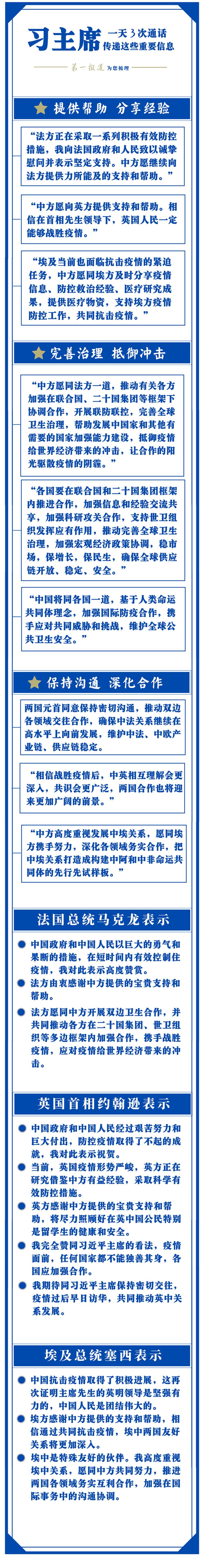 法国、英国、埃及都是具有重要影响力的大国,肩负着维护世界和地区公共安全的责任。习主席同上述3国领导人通话,一方面表达中方对3国抗疫的慰问和支持,另一方面也是通过加强与世界大国、地区大国的沟通协调,进一步推动国际防疫合作、完善全球卫生治理,携手各方、共同抵御疫情对世界经济带来的冲击。