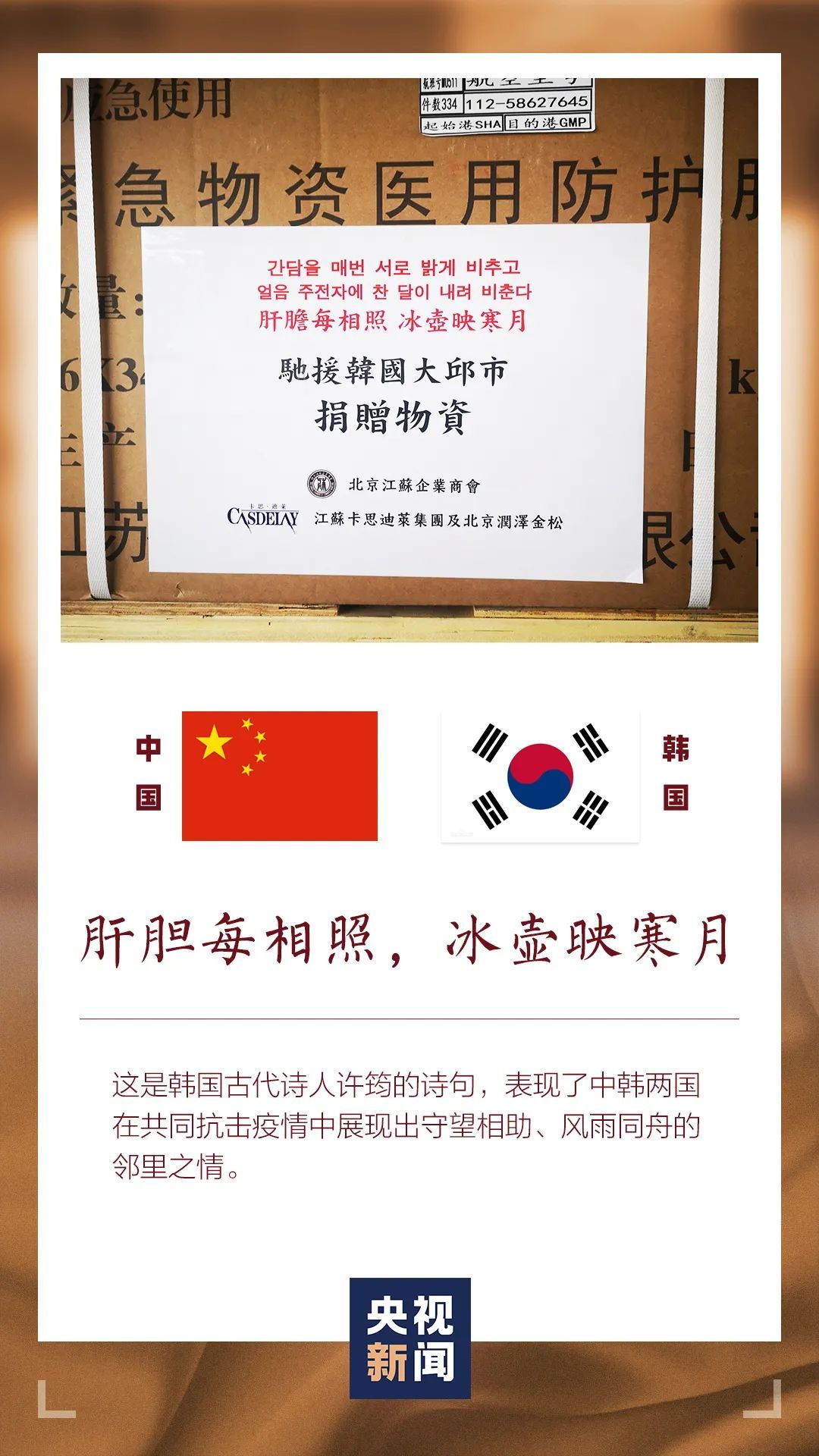 在很多中方对外提供的援助物资上都写有寄语,“千里同好,坚于金石”“青山一道,同担风雨”“人心齐,泰山移”……有诗句,也有名言,一行行简短而真挚的文字背后,是中国投桃报李的情谊,也是和世界各国共同战“疫”的坚定决心。