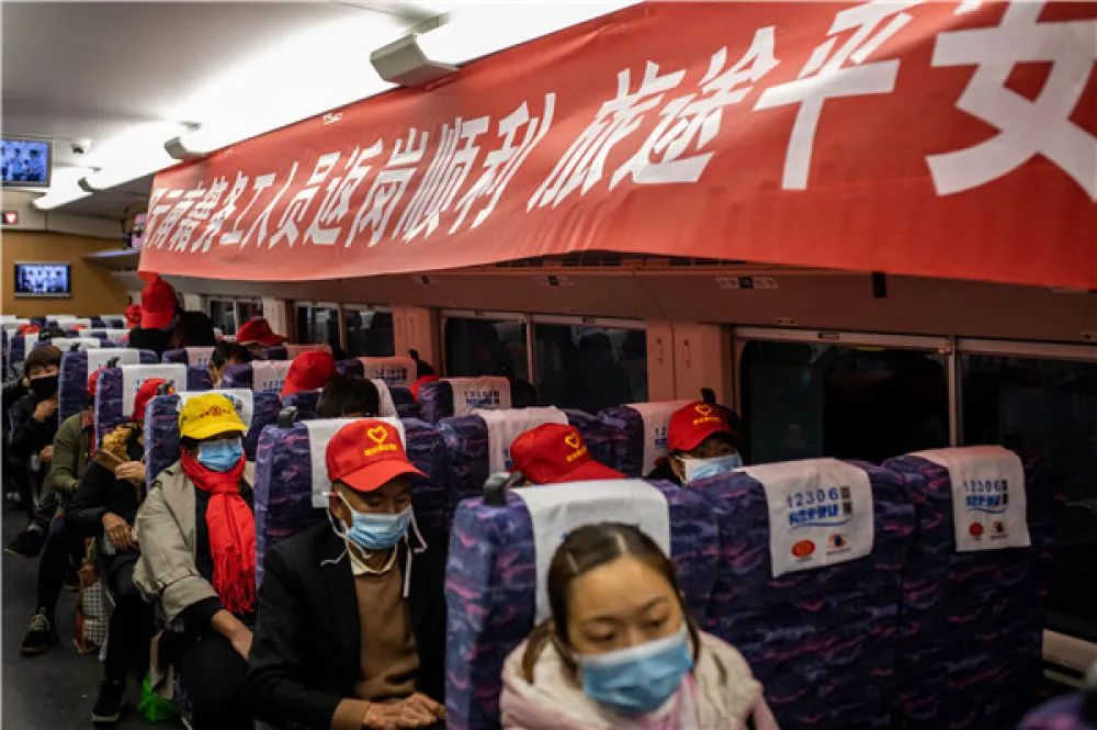 2月18日,在昆明南站,外出务工人员在 “滇粤劳务协作返岗专列”上等候发车。新华社记者 胡超 摄