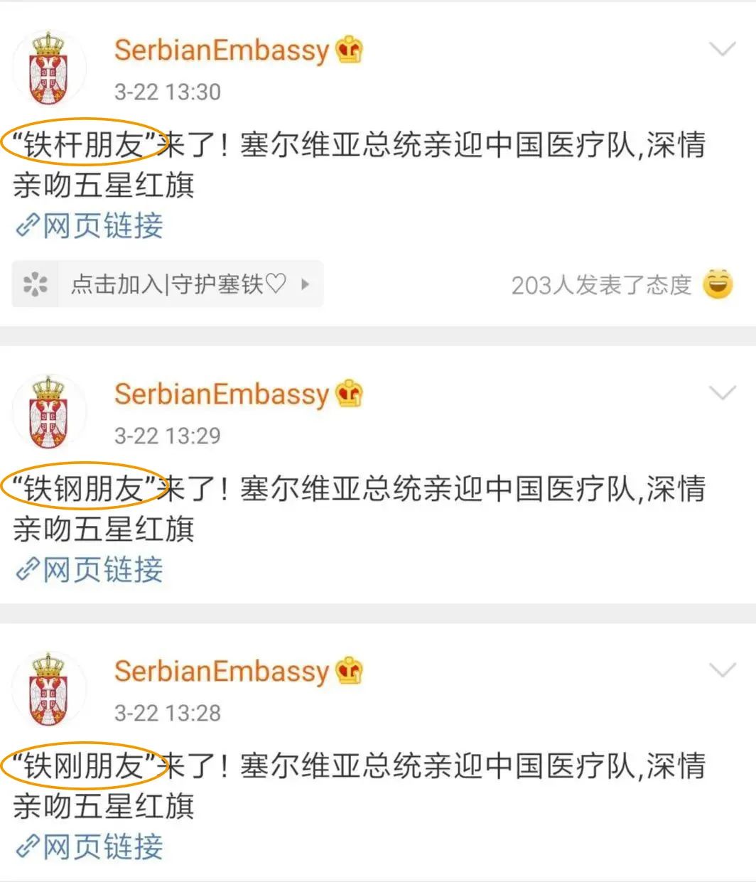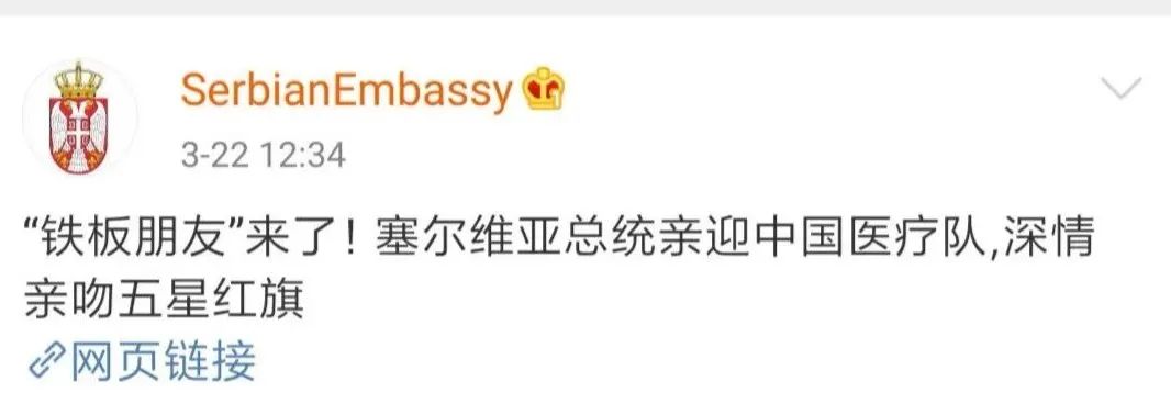 22日中午,有网友发现,塞尔维亚驻华大使馆官博突然发布了一条微博。文中除了介绍塞尔维亚总统亲迎中国医疗队、深情亲吻五星红旗的感人一幕外,还提到了一个“奇怪”的词——“铁板朋友”。