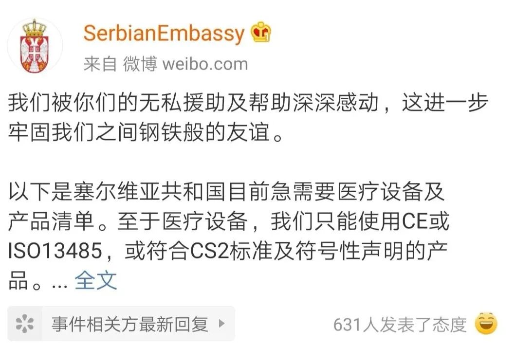 在3月15日,塞尔维亚总统武契奇发表讲话,宣布全国进入紧急状态,并含泪说出“唯一希望在中国”。当晚,中国捐赠的第一批1000份新型冠状病毒核酸检测试剂盒就运抵塞尔维亚。3月21日,塞尔维亚驻华大使馆官博发文向中国求助,并且提供了目前塞尔维亚急需的医疗设备及产品清单。