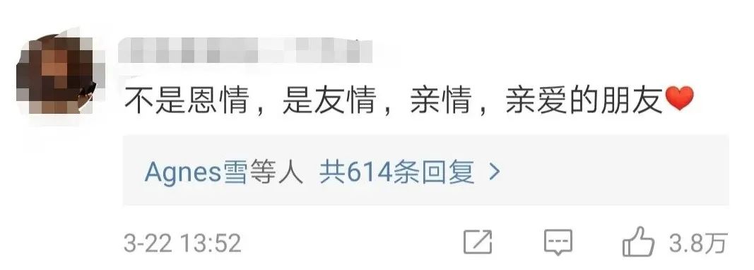 热评最高的网友回复则是:“不是恩情,是友情,亲情,亲爱的朋友。”