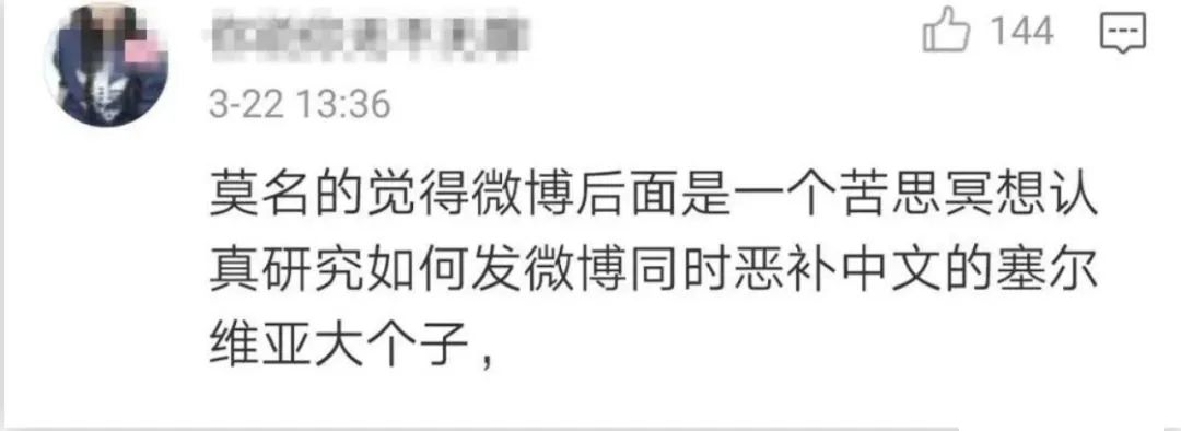 有网友表示,仿佛能想象到微博后面有一个苦思冥想恶补中文的塞尔维亚大个子。