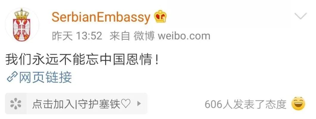 终于弄清“铁板”和“铁杆”的区别后,塞尔维亚驻华大使馆紧跟着发了一条微博:“我们永远不能忘中国恩情!”