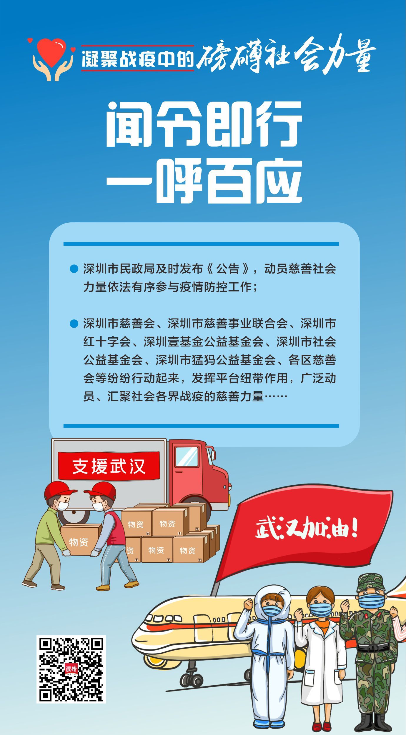 市民政局迅即成立疫情防控工作领导小组,及时发布《公告》,动员慈善社会力量依法有序参与疫情防控工作;深圳市慈善会、深圳市慈善事业联合会、深圳市红十字会、深圳壹基金公益基金会、深圳市社会公益基金会、深圳市猛犸公益基金会、各区慈善会等纷纷行动起来,发挥平台纽带作用,广泛动员、汇聚社会各界战疫的慈善力量……
