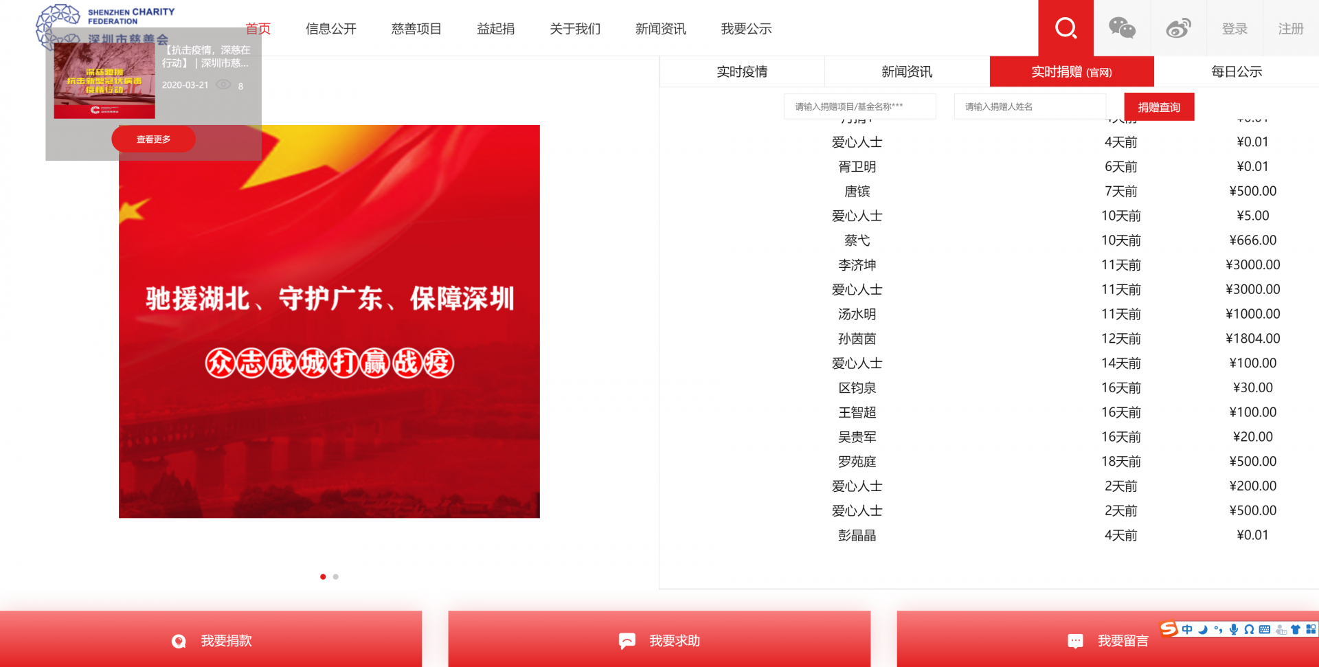 深圳市慈善会官网实时捐赠栏目上,滚动更新捐赠人名字和捐赠金额
