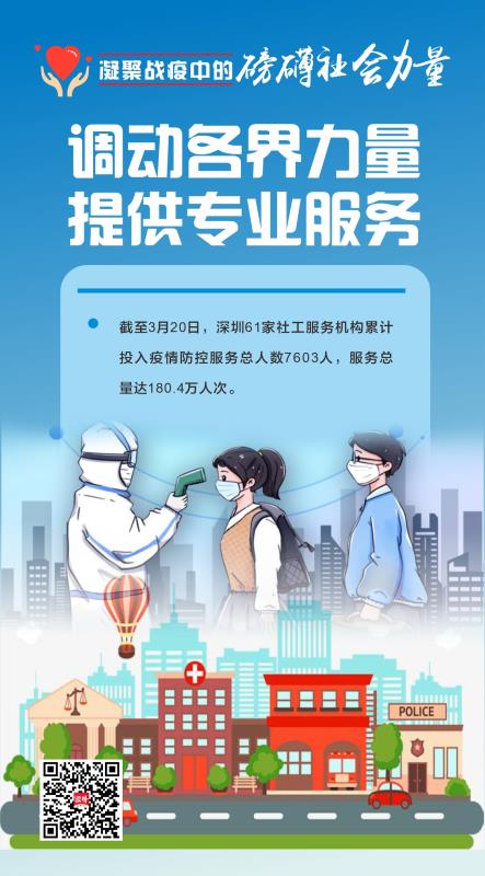 社工是社区联防联控的中坚力量。疫情期间,深圳社工持续以专业力量助力疫情防控工作的推进,密切关注残疾、孤寡老人等特殊困难群体,全力开展线上援助、情绪疏导、心理咨询、个体危机干预等工作。截至3月20日,深圳61家社工服务机构累计投入疫情防控服务总人数7603人,服务总量达180.4万人次。
