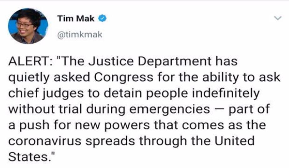 美国全国公共广播电台的一位记者在社交媒体上发出警告,美国司法部悄悄向美国国会提出要求,希望在冠状病毒紧急情况下暂停某些宪法权利,首席法官可以在紧急状况下无限期拘留未经审判的犯罪嫌疑人。