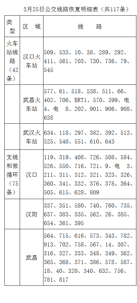 一、3月25日起,恢复汉口、武昌、武汉等三大火车站始发的42条公交线路运营;恢复中心城区(含武汉东湖新技术开发区、武汉经济技术开发区)75条区域公交线路运营(含微循环公交线路)。