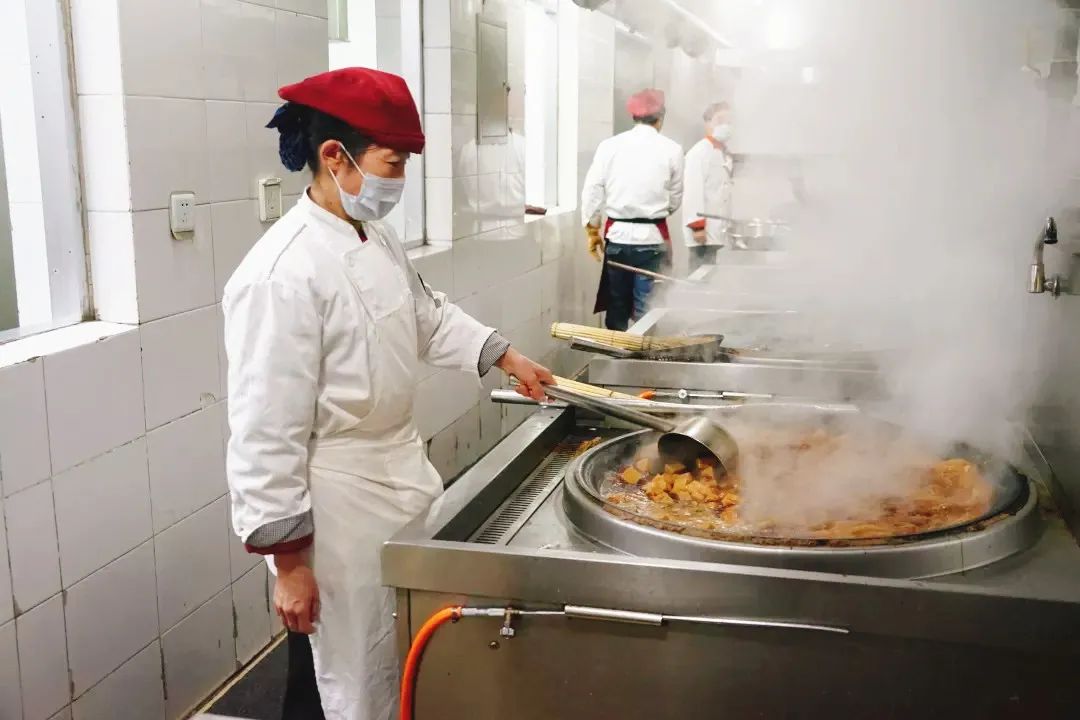 伙食团的师傅们凌晨4时进入后厨,一直要忙到晚上八九点。从准备食材、煎炒烹炸,到整理餐具、收拾摆台;从面食米饭、果蔬荤素,到保证菜品丰富多样,餐餐可口……每天要接待1000多人次分7批次就餐,确保调度员随时吃上热乎乎的饭菜。