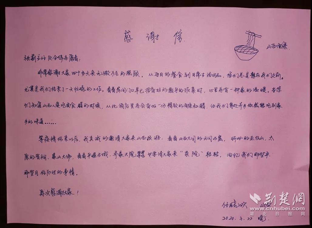 “是你们的默默付出和无私奉献,让我们感受到家人般的温暖,从早到晚是你们提供给我们最暖最贴心的生活保障,让我们随时保持最佳的身体状态与疫魔作斗争......”援鄂医疗队队长张大文在感谢信中写道。