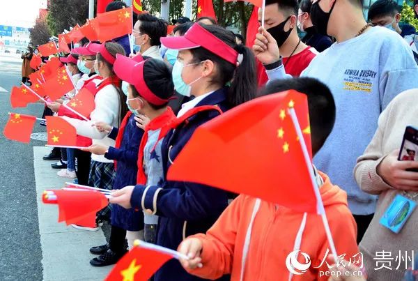 热心市民手持国旗等待英雄归来。王秀芳 摄