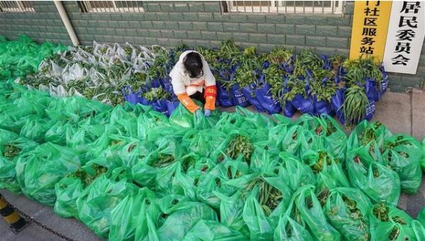 2月9日,武汉市武昌区首义路街大东门社区为部分困难居民免费提供蔬菜供应。新华社记者 程敏 摄